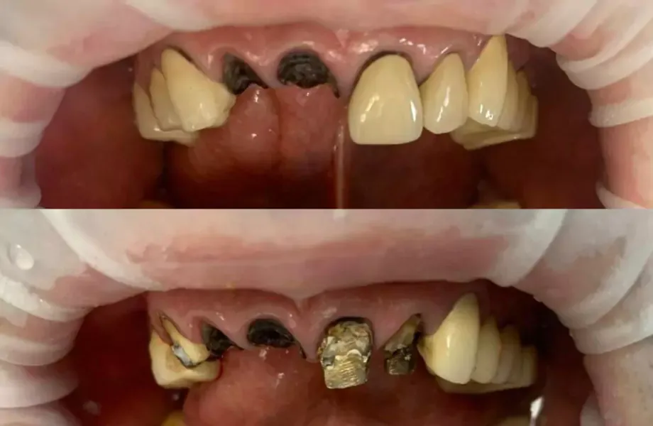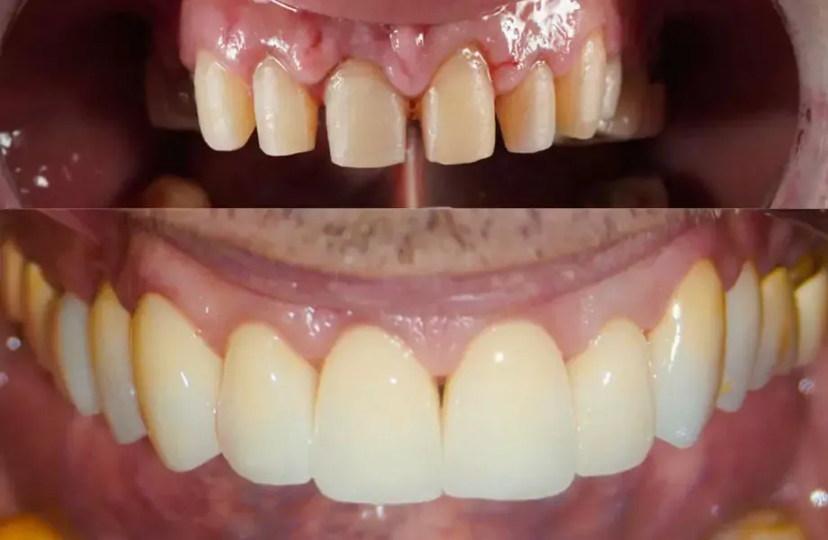 Va prezentam un caz complex de reabilitare maxilara. Dupa consultatie si prezentarea tuturor posibilitatilor, pacientul, impreuna cu medicul curant au luat decizia de a incerca recuperarea dintilor. A fost o adevarata provocare, intrucat dintii aflati sub vechile lucrari protetice, erau foarte afectati de carii. Cu ajutorul tratamentelor endodontice, restaurarii bonturilor protetice si chirurgiei mucogingivale prin alungire coronara, toti dintii pacientului au putut fi salvati. Partea protetica s-a realizat utilizand coroane din zirconiu cu aditie ceramica.